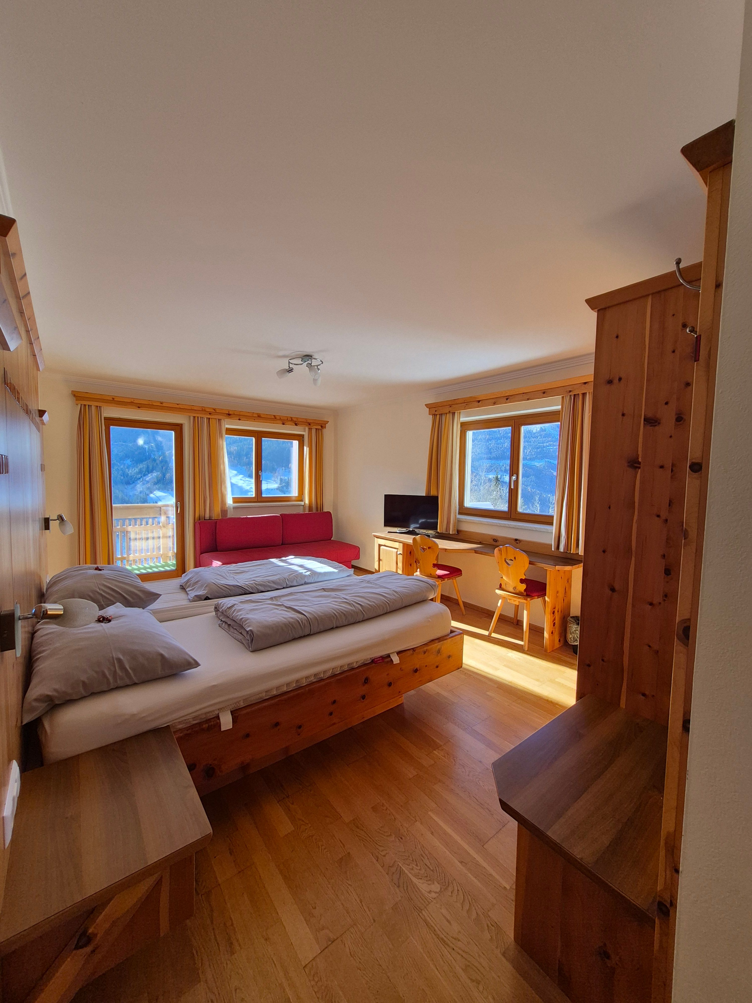 Familienzimmer (30 m²) für 3–4 Personen mit Doppelbett, Schlafsofa, Balkon mit Bergblick und eigenem Bad. Komfortable Ausstattung: WLAN, TV, Sitzecke und Heizung – ideal für Familienurlaub.